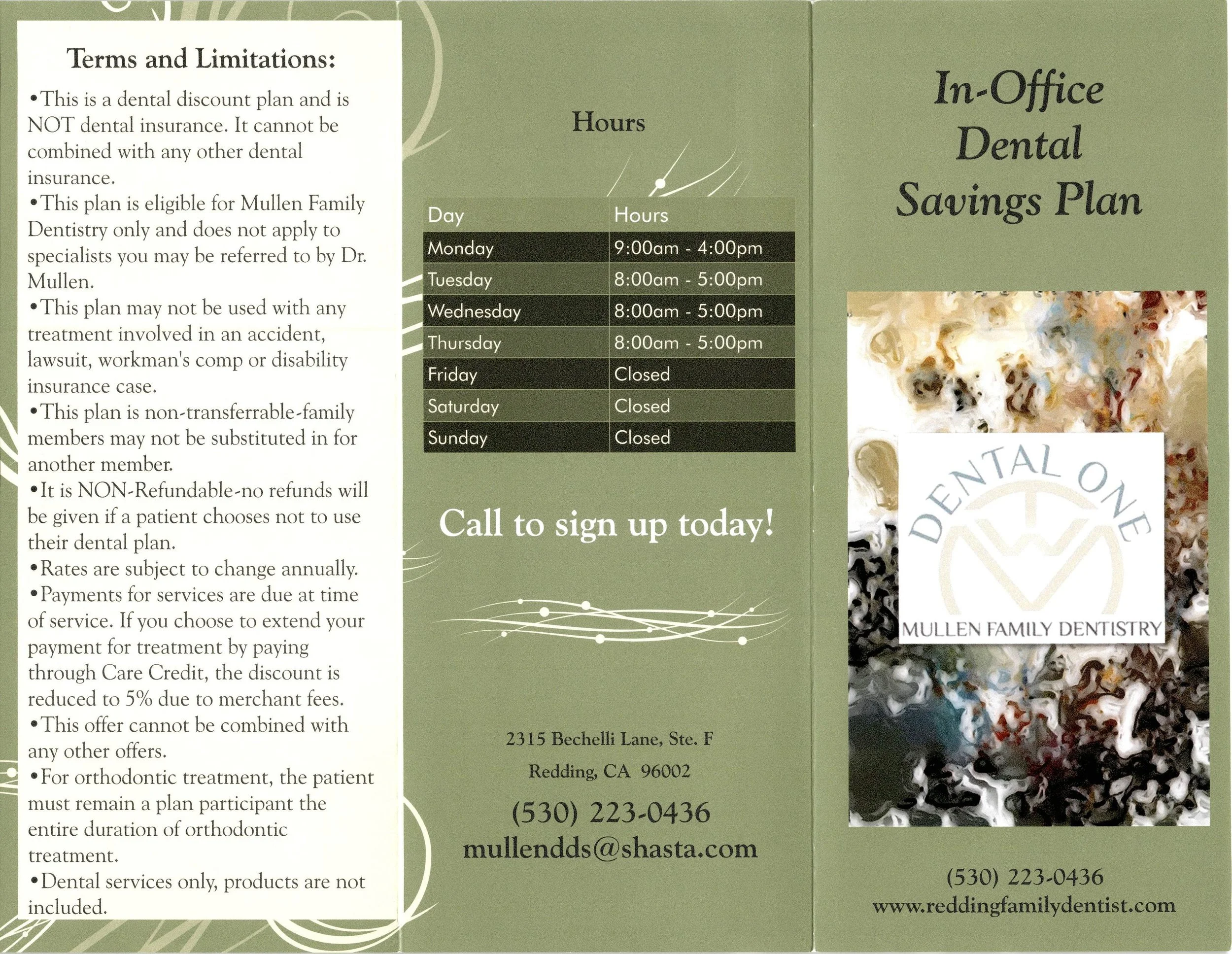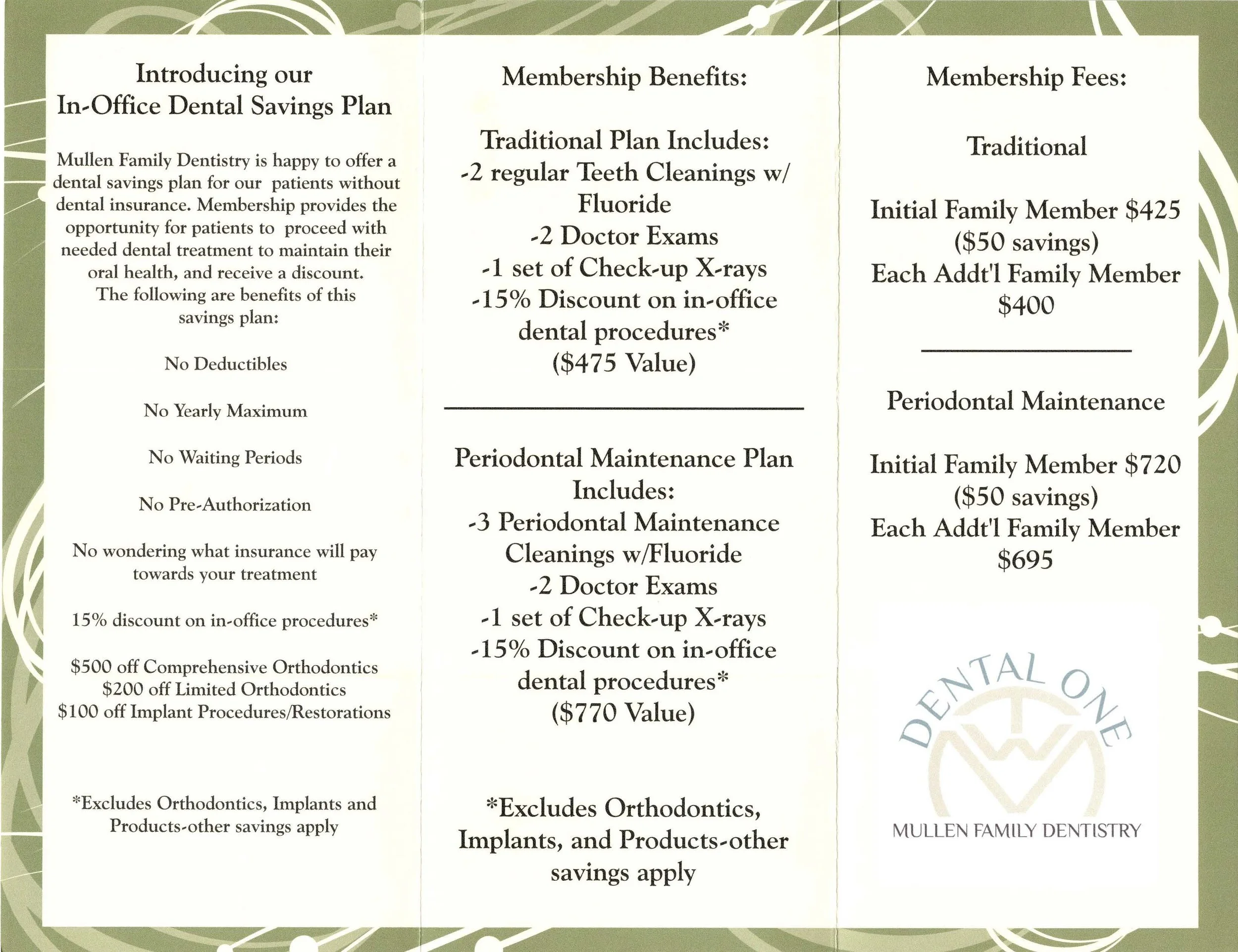 Mullen Family Dentistry is happy to offer a dental savings plan for our patients without dental insurance. Membership provides the opportunity for patients to proceed with needed dental treatment to maintain their oral health, and receive a discount. See brochure for more details. Print and bring into your next appointment.